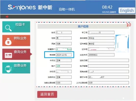 3.卡片有效期可在自助机上查询(详见校园卡查询业务)或每周四下午(2:00--4:00)至行政楼414查询。